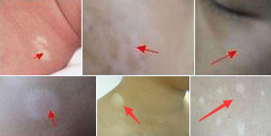 白斑疾病变呈纯白色圆形或不规则的脱失斑,其内毛发可变白或正常,但皮肤无其它变化,亦无自觉症状。表面光滑,边界清楚,边缘色素增多。