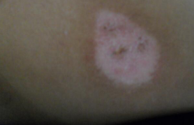 白斑初期阶段,白斑多为指甲至钱币大,近圆形、椭圆形或不规则形,也有起病时为点状减色斑,境界,有的边缘绕以色素带。